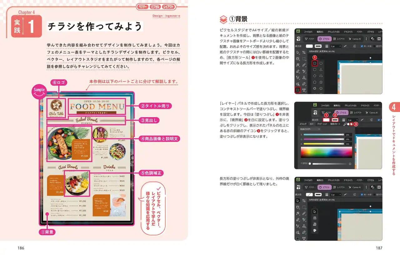 | 購入者特典として、本書の解説や各章の「実践」ページで使った作例データ(Affinity形式)をダウンロードできます。作例データを使って、紙面と同じように手を動かしながら学ぶことができます。 | ||||||||||||||||