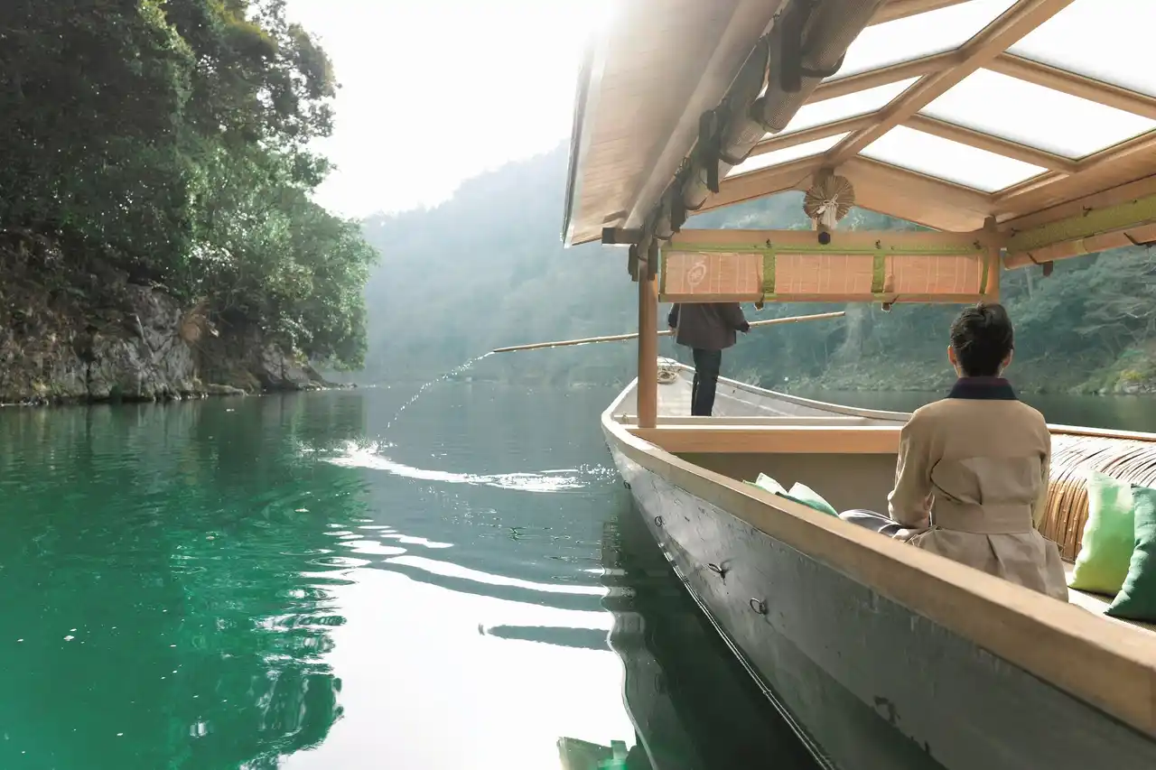 | 星のや京都の目の前を流れる大堰川(おおいがわ)に、星のや京都専用の屋形舟・翡翠を浮かべ、嵐山の風景を愛でながら和菓子と抹茶を楽しみます。二十四節気(*2)の清明(せいめい)から穀雨(こくう)にかけては、柔らかな陽光の中で若葉が一斉に芽吹く、生命力に満ちた時期です。そこから立夏には瑞々しく青い新緑へ、大暑(たいしょ)には深く静まりかえる万緑へと、景色は刻一刻と表情を変えていきます。その季節、瞬間ならではの嵐山の移ろう景色を愛でる体験です。 | |||