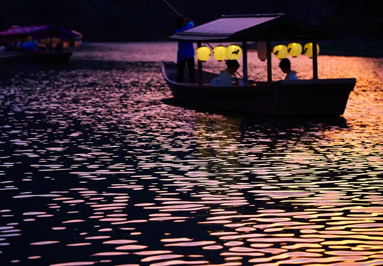 | 嵐山の夏の風物詩である「鵜飼」を、貸し切りの屋形舟「翡翠」から間近に眺める贅沢な夕涼みのひとときを過ごせます。舟の中では、日中の暑さを忘れるような涼やかな風に吹かれながら、お酒とおつまみを片手に、夏の夜の時間を独占できる優雅なひとときです。かがり火が水面を赤々と照らす幻想的な雰囲気の中、鵜匠が巧みに鵜を操る古典的な漁法を目の当たりにすることができます。平安貴族も愛でたといわれる文化に触れながら、時を忘れるような雅な夜の時間を過ごせます。 | |||