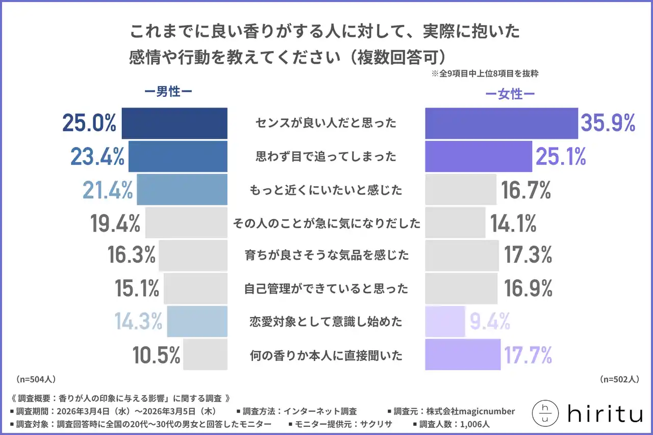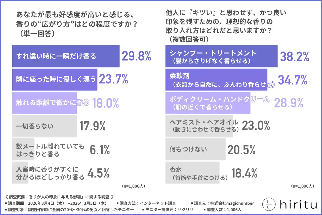そこで今回、株式会社magicnumber(https://magicnumber.co.jp/)は、全国の20代~30代の男女を対象に、「香りが人の印象に与える影響」に関する調査を行いました。 |