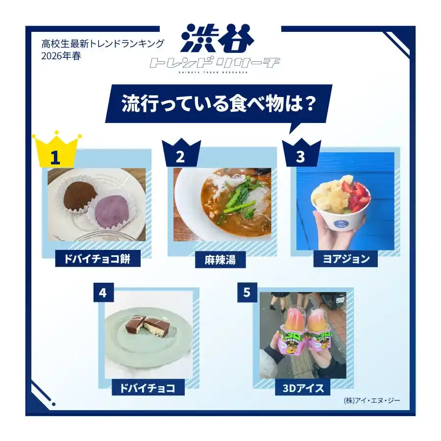 「友達とご飯に行くとなったら、必ず候補に入る」(高3・女子)という声もあり、自分好みに具材をカスタマイズできる楽しさとヘルシーさが、高校生の間で不動の支持を集めています。3位は、前回調査から引き続き注目されている「ヨアジョン」でした。ヨーグルトアイスにフルーツやナッツ、はちみつなどをトッピングして楽しむ韓国発のデザートで、「さっぱりしていて美味しい。見た目も可愛いのでSNS映えする」(高1・女子)などの声が多く寄せられています。気温が上がるこれからの季節に向けて、さらなる人気上昇が期待されます。 |