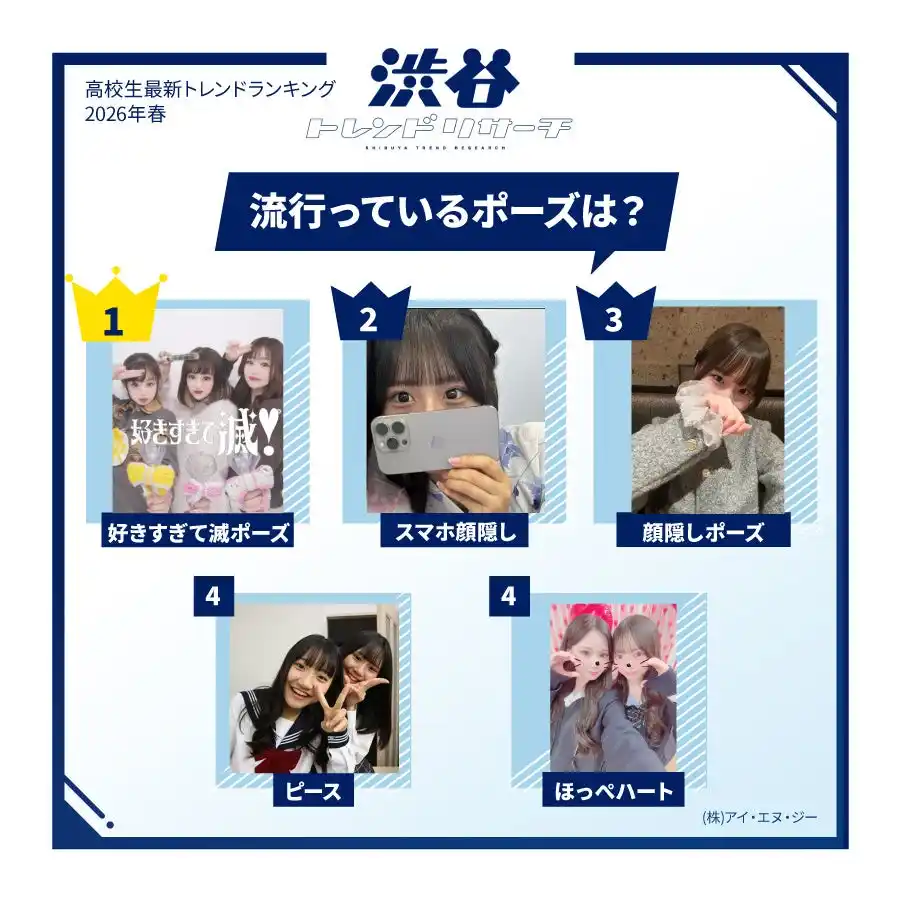 第1位には、「流行っている言葉」でも3位にランクインした「好きすぎて滅ポーズ」が輝きました。「見た目が可愛い」(高3・女子)という声に加え、「ポーズを取りながら『〇〇すぎて滅!』と言うのが流行っている」(高2・男子)といったコメントも。撮影時のテンションを上げる「掛け声」としても定着しているようです。2位は、令和の定番ともいえる「スマホ顔隠し」。「BeRealを見るとみんなやっている」(高2・男子)、「大人数で撮る時にしている友達が多い」(高1・女子)などの声が寄せられました。