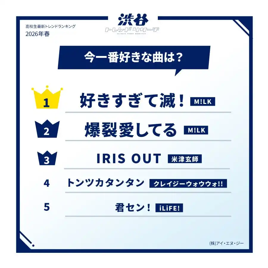 「『マジで終わった』という時や、やばい時にみんな『滅』を使っている」(高2・女子)、「どんな言葉にも組み合わせて使える」(高3・男子)といった声があり、汎用性の高い感嘆詞として流行中です。2位は、前回調査で1位だった「めろい」がランクイン。「メロメロになるほどかっこいい・かわいい」を意味し、「誰かがモテそうな行動をした時に、みんなで『めろい』とハモる」(高2・女子)といったエピソードからも、高校生の間で定着している様子がうかがえます。3位は、1位の派生元である「好きすぎて滅」でした。前作『イイじゃん』に続き、新曲をリリースするたびにトレンドを席巻する「M!LK」。まさに今、高校生の間で「M!LK旋風」が巻き起こっている結果となりました。 |