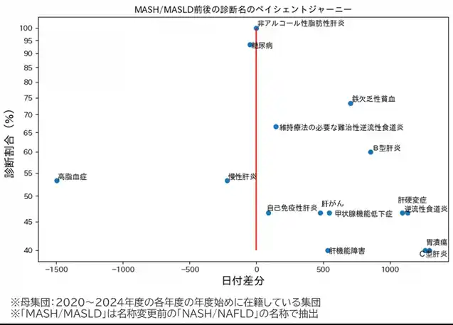 MASLD/MASHの診断前には、「高脂血症」等の生活習慣病や「慢性肝炎」の診断名がついていることが確認されました。MASLD/MASHの診断後、おおよそ1年半から3年の間で「肝がん」、「肝硬変症」などの診断名が散見されました。 |