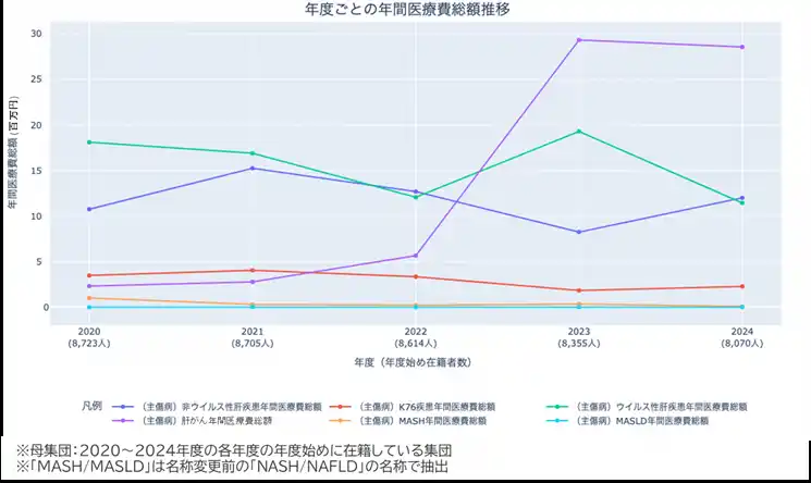 2.肝疾患にかかる医療費を時系列で可視化したところ、肝がん(※3)発症に伴う治療等により医療費が大きく増大する傾向が確認されたこと |
