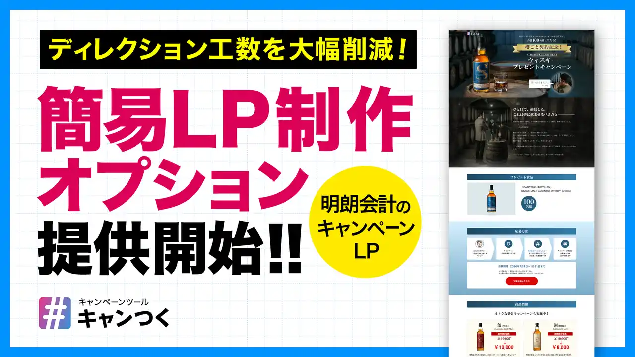 | ひとりでも勝てるキャンペーンツール「キャンつく」を提供する株式会社ピクルス(東京都品川区、代表取締役 田中 稔、以下「当社」)は、SNSキャンペーン用のランディングページ(LP)を制作するオプションサービス「簡易LP制作オプション」の提供を開始いたします。ライト・ミドル・オリジナルの3つのプランから選ぶだけで、キャンペーン概要や応募規約を掲載する特設ページを手間なく立ち上げることが可能です。 | |||