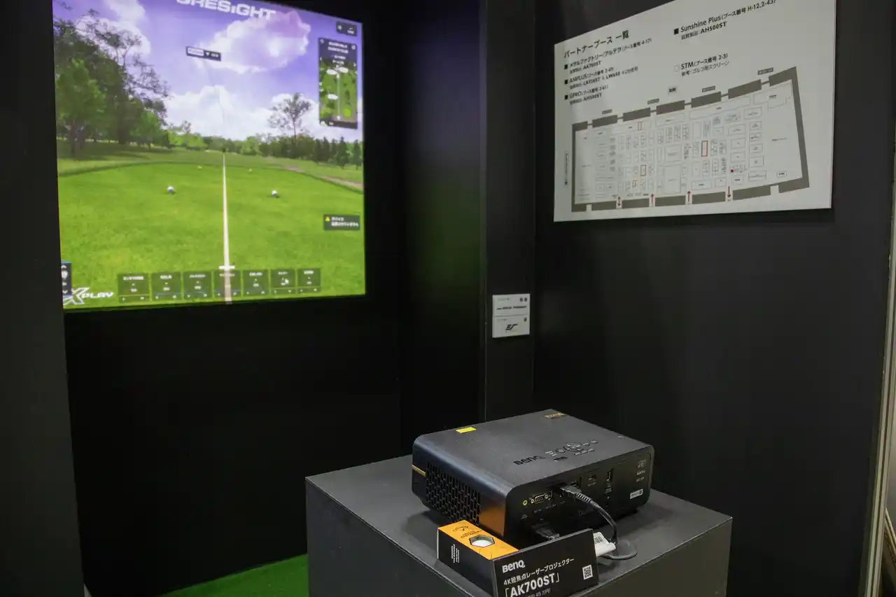 BenQブースだけでなく、JGF2026会場内の「メタルファクトリー/アルテラ」、「AMPLUS」、「GPRO」、「Sunshine Plus」などのパートナーブースでも、BenQプロジェクターを組み合わせたゴルフシミュレーターの実演が行われました。 |
