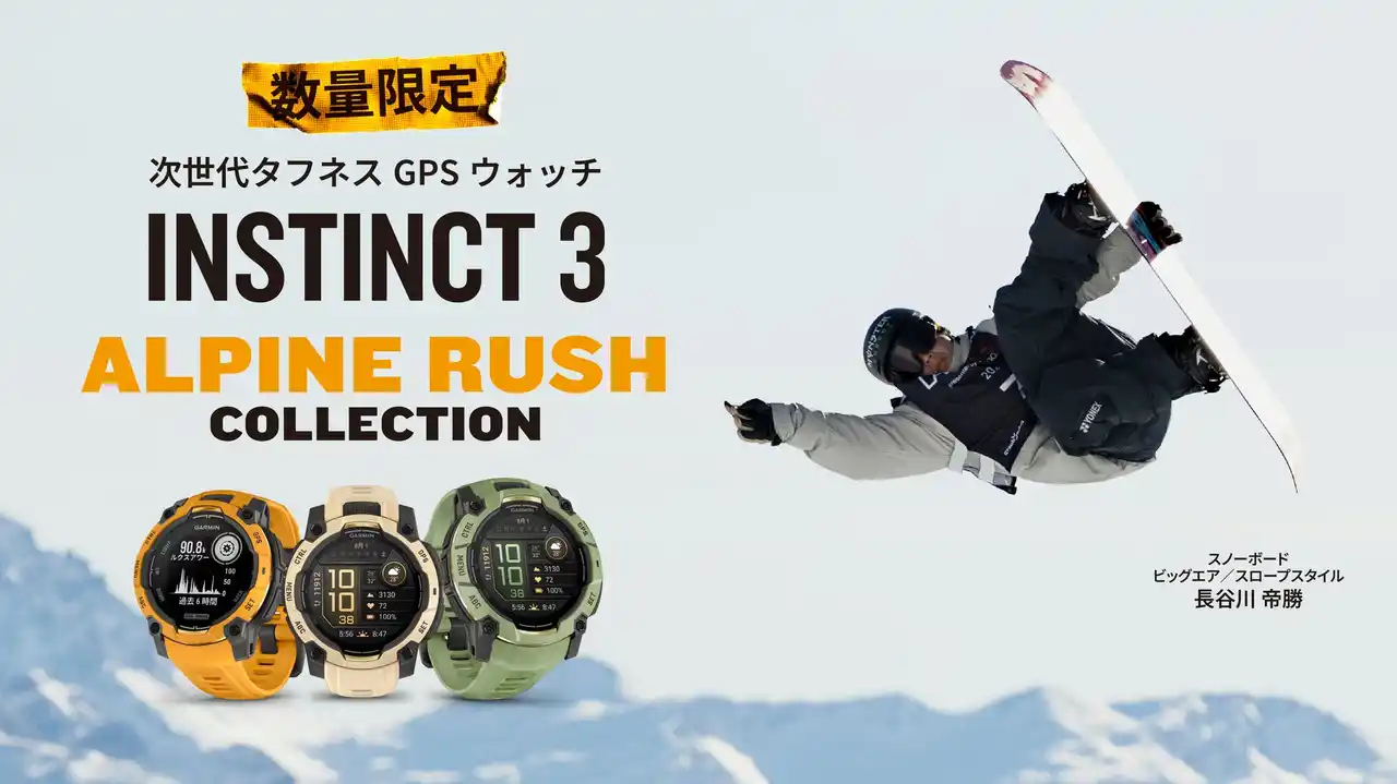 「Instinct 3」シリーズ 数量限定モデル「Alpine Rushコレクション」。Garminアンバサダーでありスノーボーダーの長谷川帝勝選手をメインビジュアルに起用。 |
