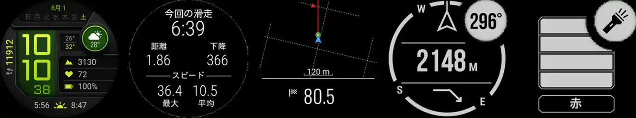 左から、AMOLEDモデルのウォッチフェイス、スキー、ナビゲーション、Dual Powerモデルの電子コンパス、フラッシュライト |