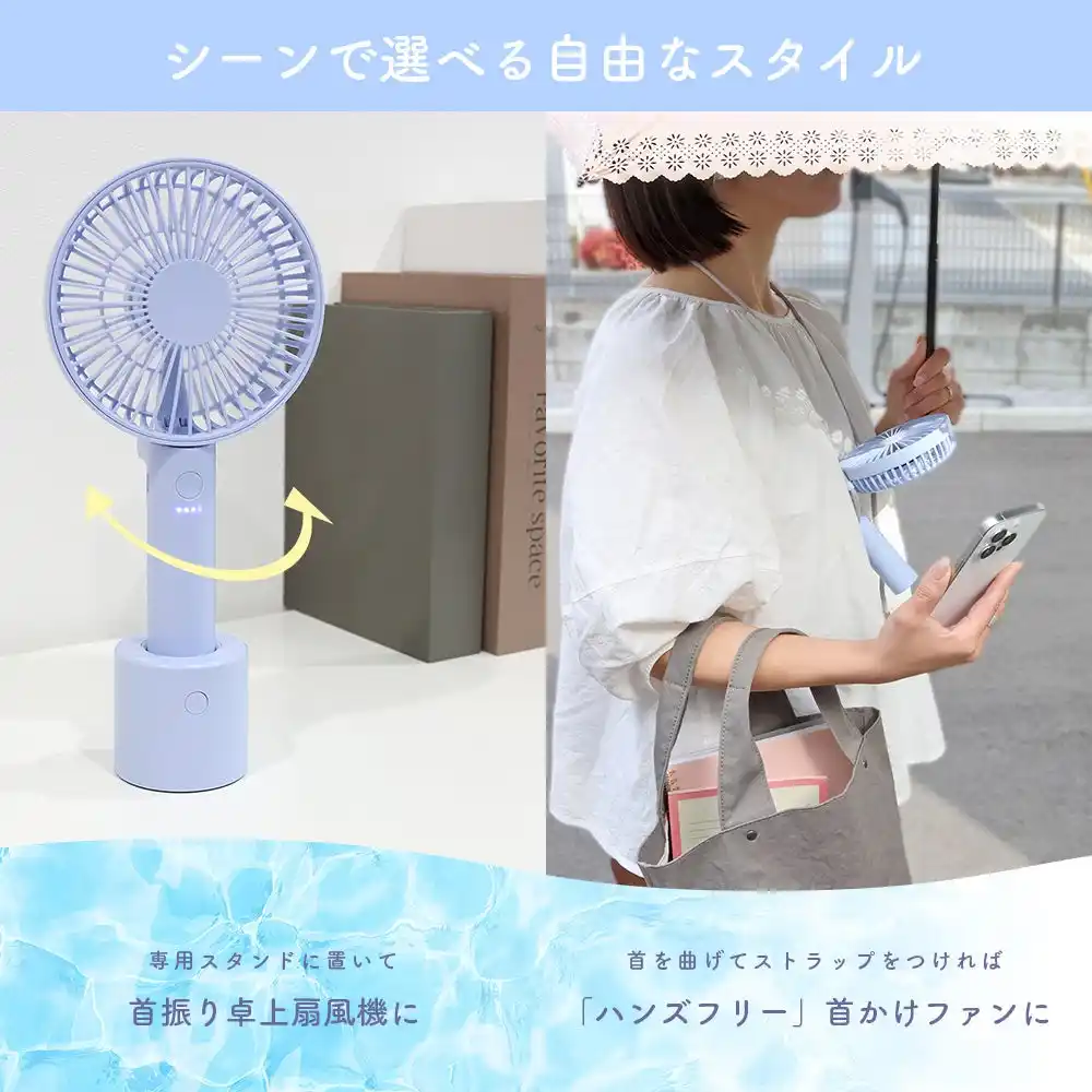 「スタンドに置いて卓上ファン」「外出時は手持ちファン」「付属ストラップで首掛けファン」と、3通りの使い方が可能。 |