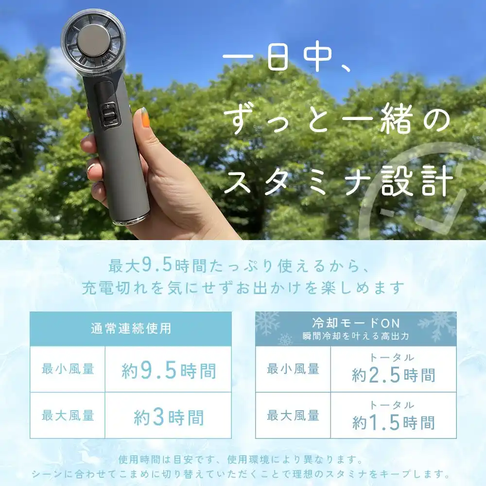 最大で13.5時間の連続使用が可能。(※使用風量により異なります、最小3.5時間)一日中涼しさが続くスタミナ設計です。 |