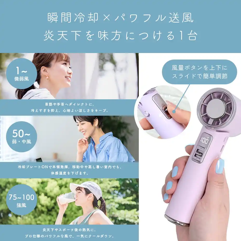風量は1~100段階で細かく切り替えられるため、静かなオフィスでの微弱風から、炎天下での強風まで、シチュエーションに合わせて「自分だけの最適な涼しさ」を選べます。 |