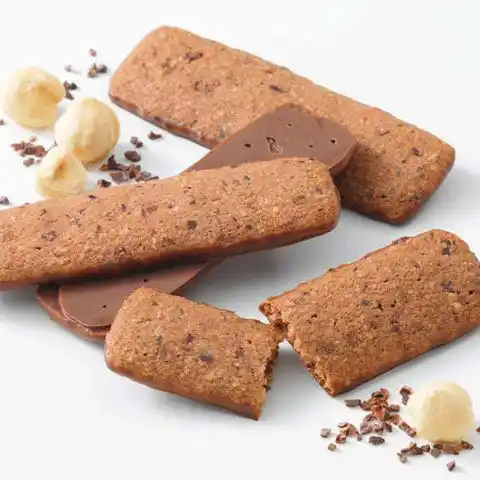 | 細かく砕いたカカオ豆とヘーゼルナッツパウダーをブレンドしたココア生地のクッキーの片面に、まろやかな味わいのチョコレートをコーティングしました。 | |||||||||