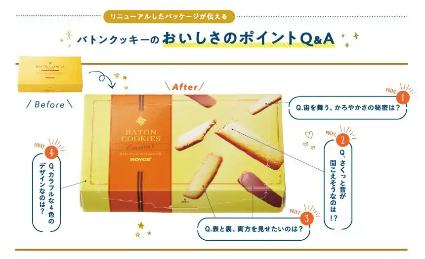 | 新パッケージのコンセプトは、ずばり“バトンクッキーのおいしさをもっと伝えたい”という熱い想い。 | |||||||||