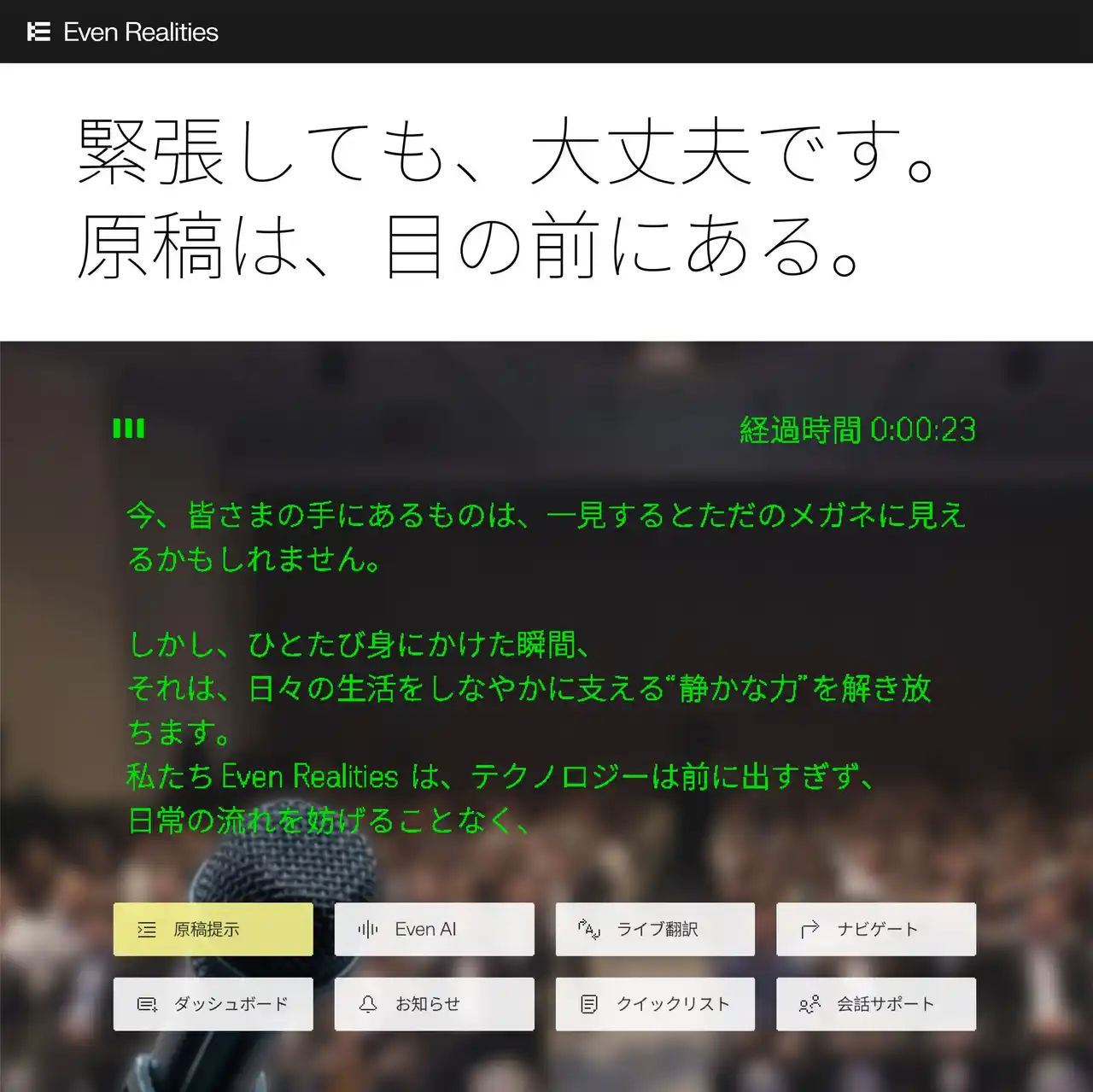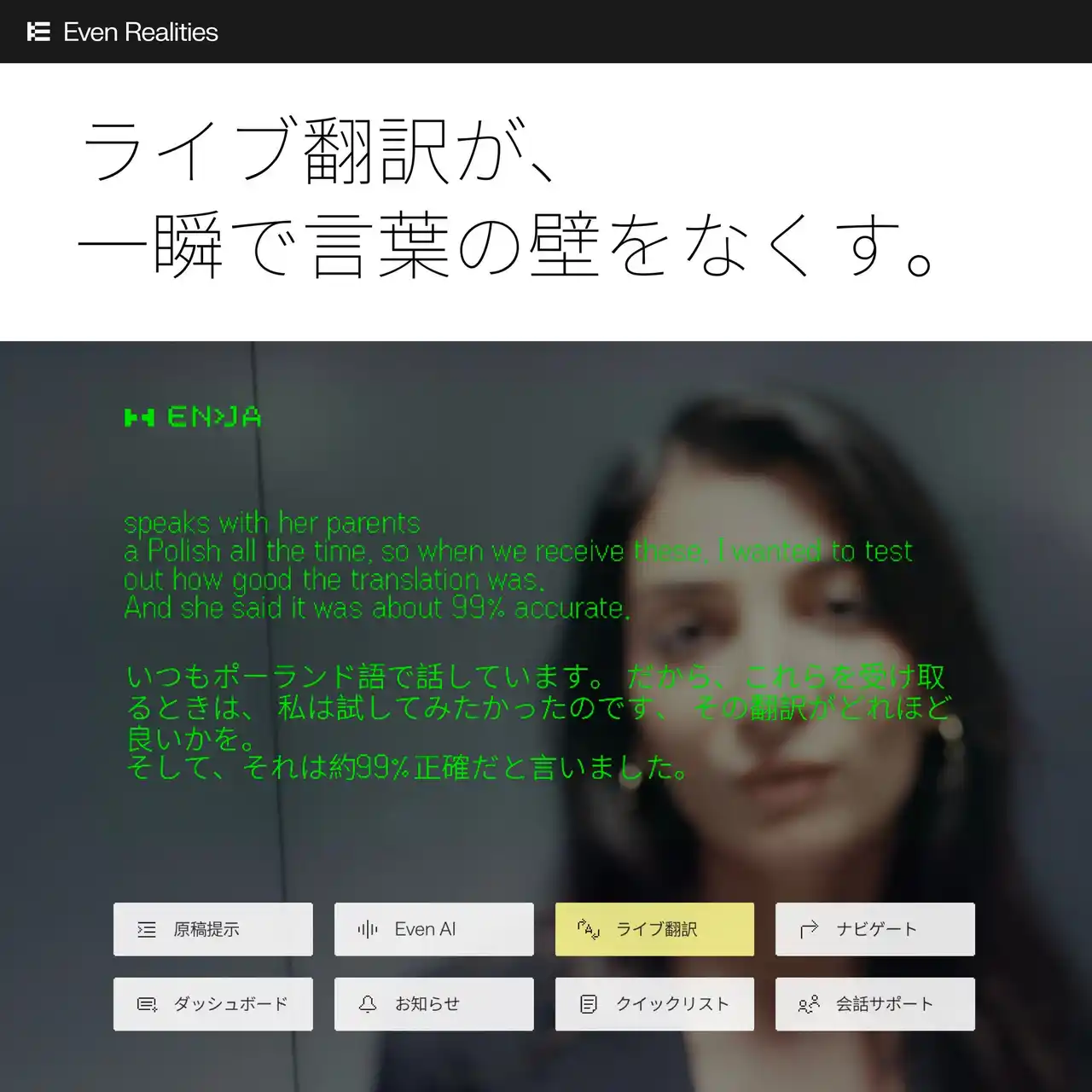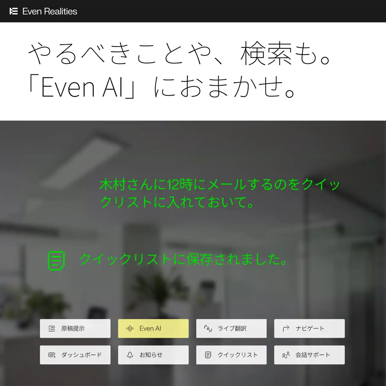 | 詳しい機能説明:https://www.evenrealities.com/ja-JP/smart-glasses | |||||||||||||||||||