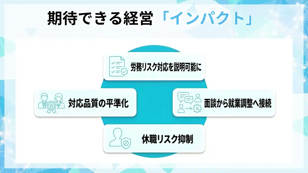 面談実施率・再発率などの運用指標で改善を追い、労務リスク対応を説明可能な形に整備します。 |