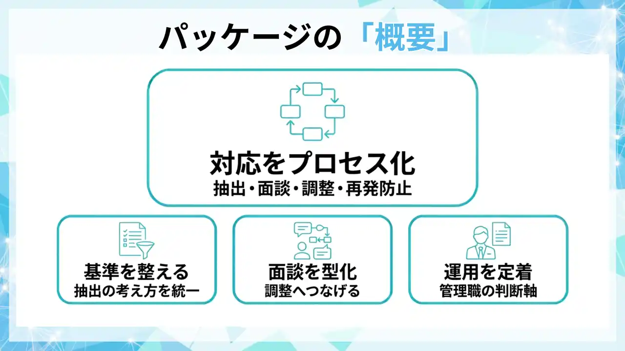 本パッケージは、抽出基準、面談フロー、管理職運用、記録テンプレを整備し、実施率と再発率を運用指標として管理できる状態を作ります。 |