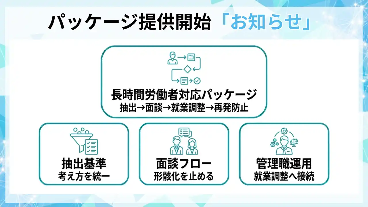 本パッケージは、長時間労働者対応を抽出→面談→就業調整→再発防止までプロセス化し、抽出基準・面談フロー・管理職運用・記録テンプレを標準化して運用定着させる支援です。 |