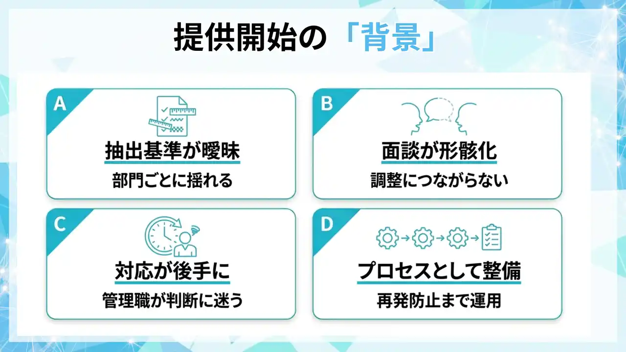 抽出基準が部門ごとに揺れる、面談が「実施した」だけで終わり就業調整につながらない、管理職が判断に迷い対応が後手になる、記録の粒度が不揃いで監査・説明に耐えない、といった課題が発生します。 |