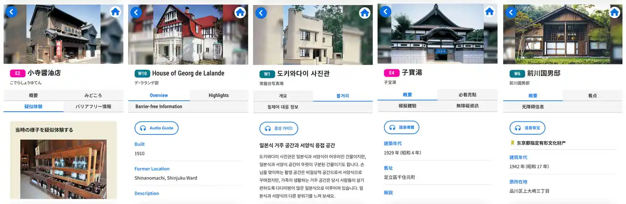 | 「江戸東京たてもの園鑑賞ナビ」は、園内に移築保存された30棟の復元建造物と、29点の屋外展示物の解説を音声とテキストによりご覧いただける無料コンテンツです。より幅広いお客様に楽しんでいただけるよう多言語化を進め、日本語と英語に加えて、今春から韓国語と中国語(繫体字・簡体字)が新たに加わり、計5言語でご覧いただけるようになりました。ぜひ、「江戸東京たてもの園鑑賞ナビ」とともに、園内の散策をお楽しみください。 | |||||||||||||||||||