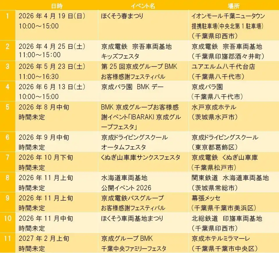| 京成電鉄(本社:千葉県市川市、社長:天野 貴夫)をはじめとする京成グループでは、日頃からのご愛顧に感謝し、お客様とのふれあいを通じて京成ファンになっていただくべく、各社にて「京成グループBMKお客様感謝イベント2026」を開催します。 | ||||||||||||||