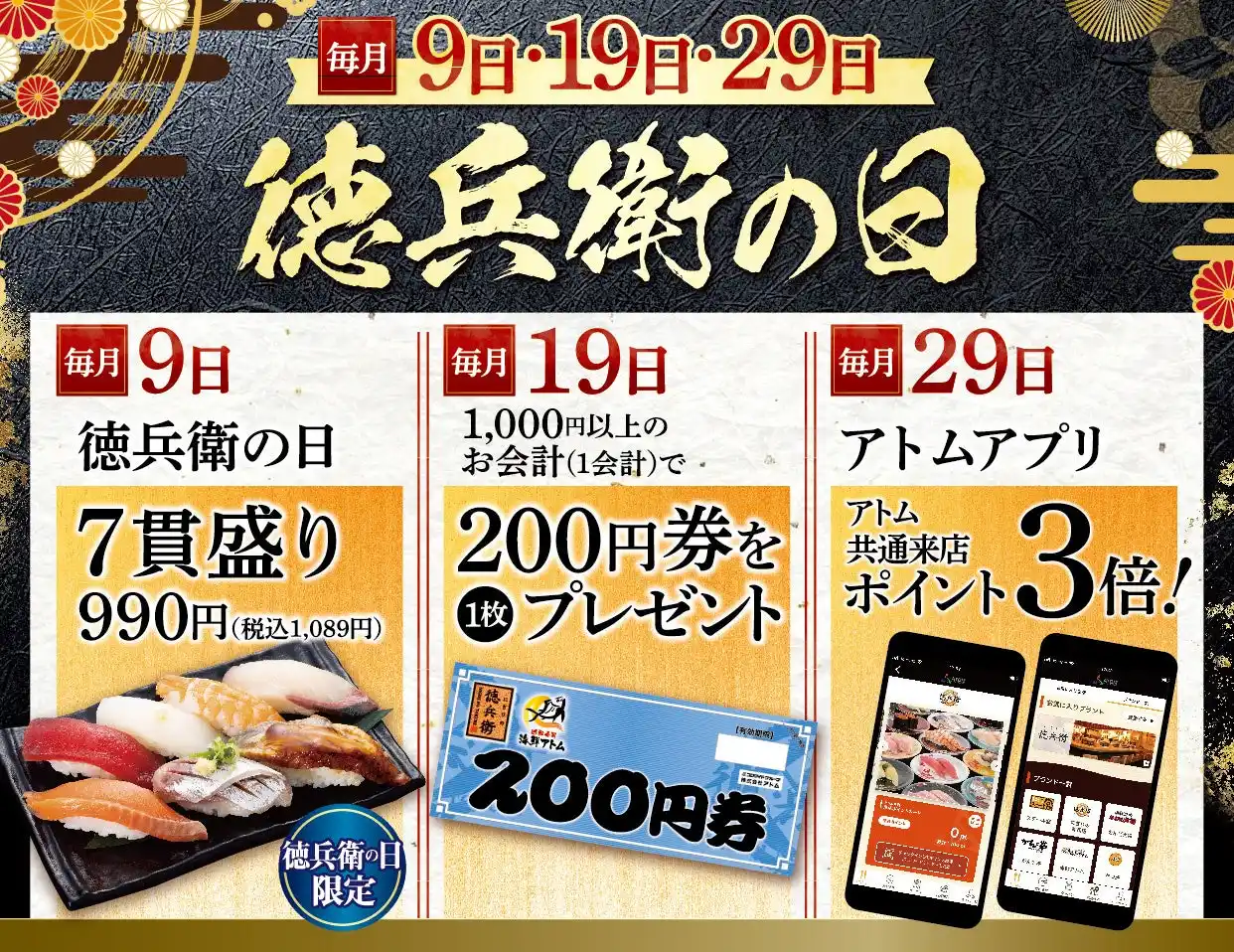 | ※【にぎりの徳兵衛】富田店、天王店、扶桑店、関店、桑名店、今伊勢店、稲沢店ではアトムアプリを運用しておりませんので、毎月29日のサービス内容が上記内容と異なります。詳しくは店舗までお問い合わせください。 | |||||||||