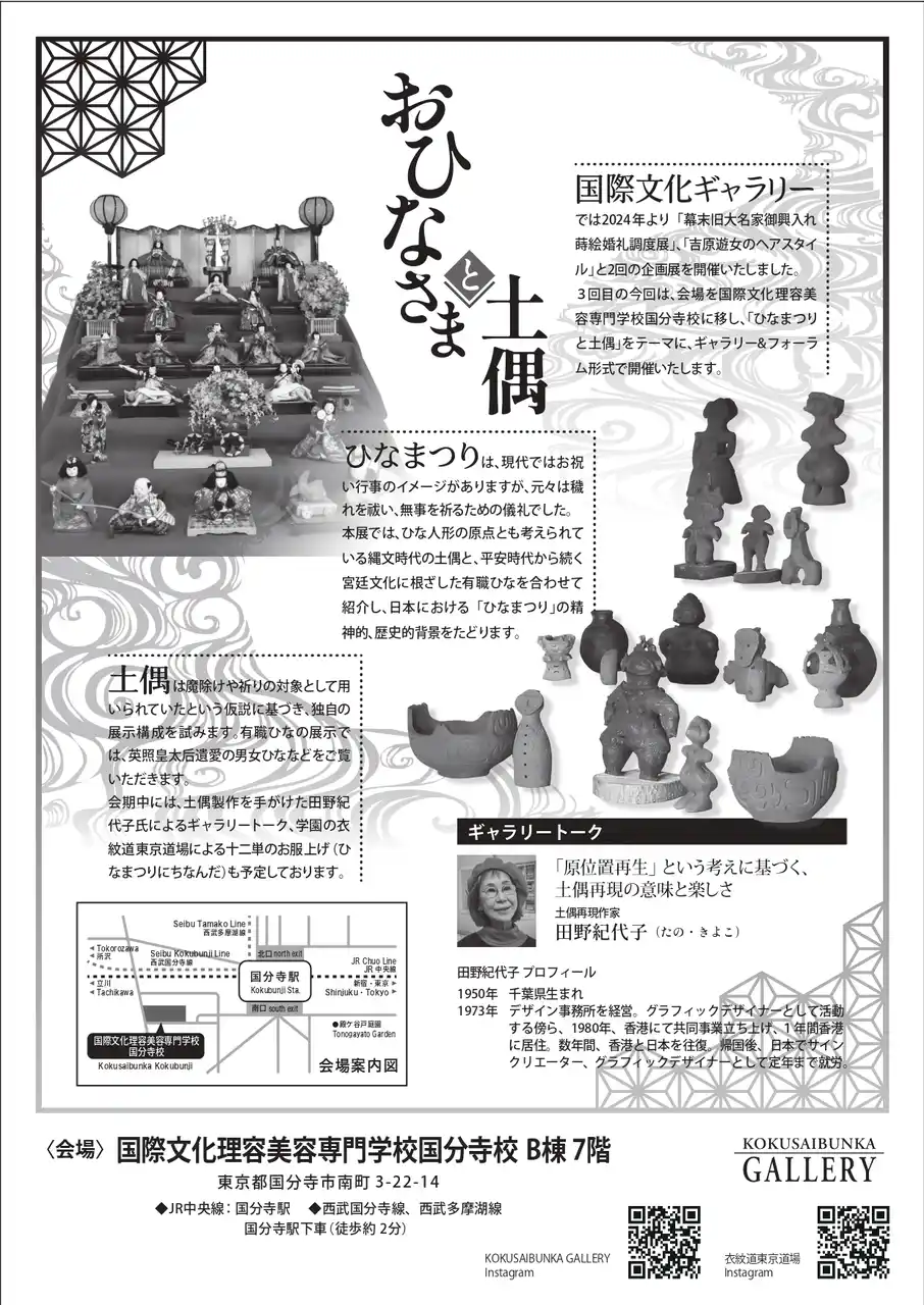 一見異なる二つの造形を通して、日本における「ひなまつり」の精神的、歴史的背景をたどる企画展「おひなさまと土偶 ― 穢れと祓えと祈り ―」を、2026年4月2日(木)から4日(土)まで国際文化理容美容専門学校国分寺校(東京都国分寺市)にて開催いたします。