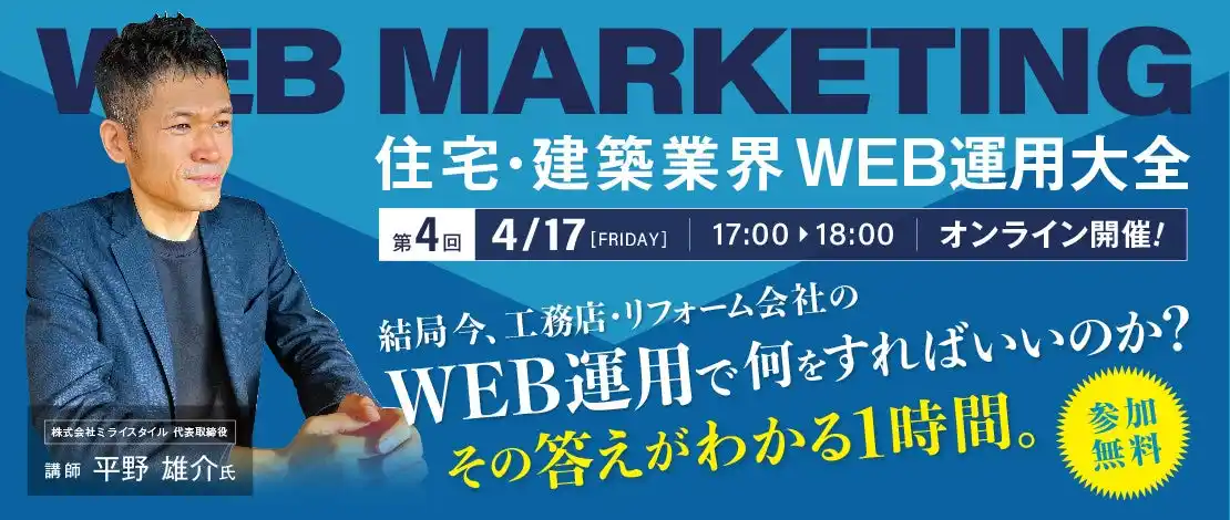 株式会社ミライスタイル(本社:茨城県つくばみらい市、代表取締役:平野雄介)は、2026年4月17日(金)17:00より、住宅・建築業界の経営者およびWEB担当者向けに「Vol.4 住宅・建築業界 WEB運用大全」と題した無料オンラインセミナーを開催いたします。 |