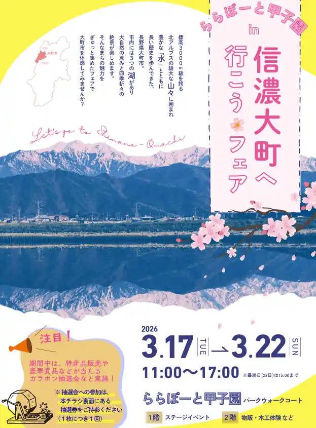 長野県大町市は、標高3000m級を誇る北アルプスの雄大な山々に囲まれた自然豊かなまちです 。市内には3つの湖があり、四季折々の絶景が楽しめます 。長い歴史を歩んできた豊かな「水」とともに育まれた、大自然の恵みとまちの魅力を、ららぽーと甲子園にぎゅっと集めてお届けします 。 |