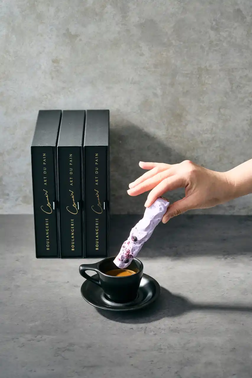 コーヒーにディップすると、ウッフバトンの甘さとコーヒーの苦さが程よいコントラストに。 おすすめ:ブルーベリー |