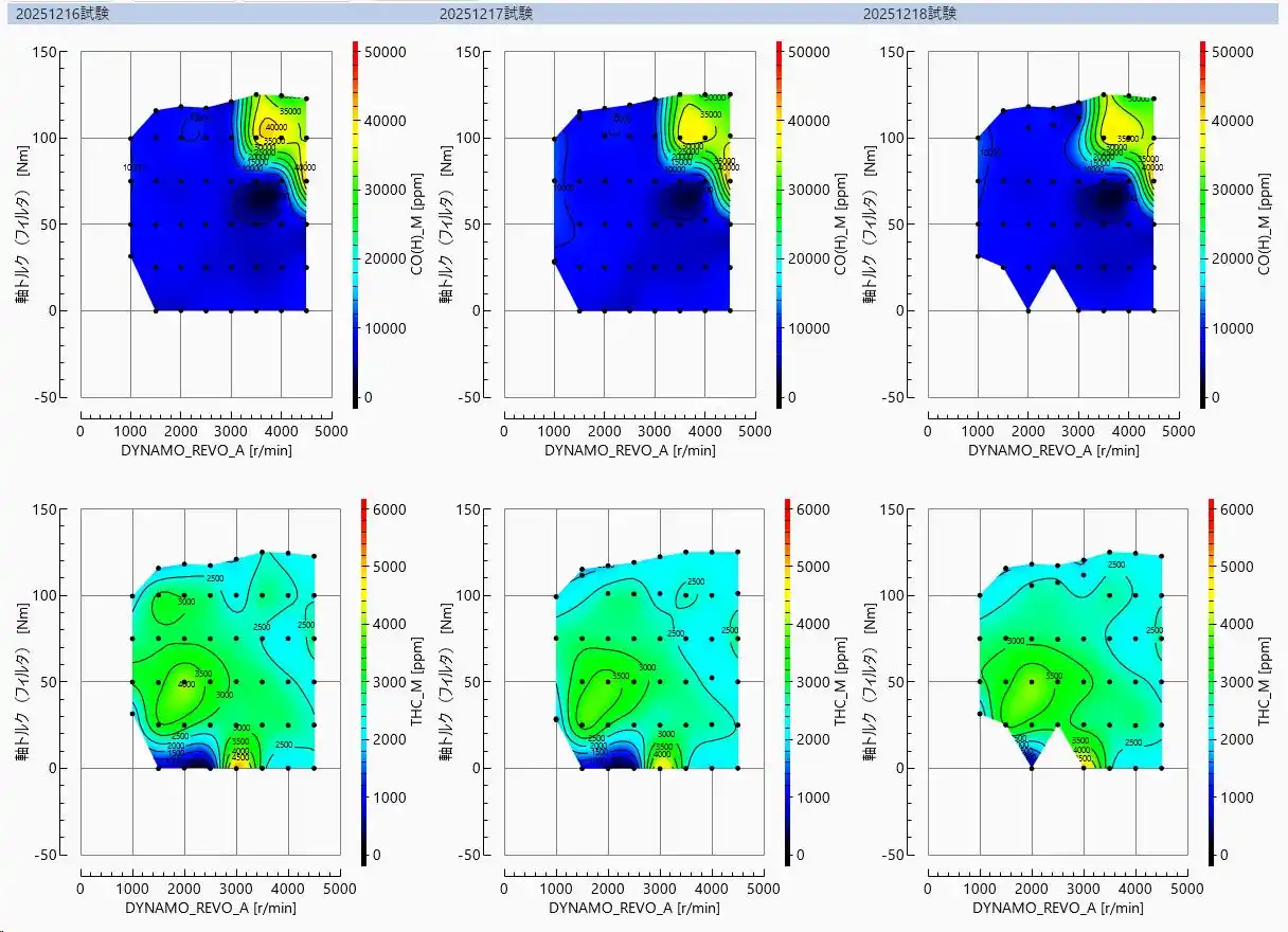 XYプロットは、試験の目的に合わせてデータを自動で仕分けし、散布図として表示する機能を搭載しています。コンターマップおよびデジタルマップは、インポートした3次元データが格子状にない場合でも補間処理を行うことで、等高線や数値による補間結果を確認できます。 |