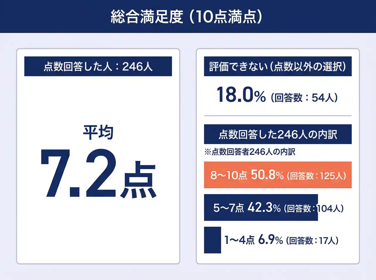| 総合満足度は10点満点で聞きました。点数で評価した人は246人で、平均は7.2点でした。8~10点(高評価)は50.8%(125人)と、一定の満足は得られている一方、評価できない(まだ住んでいない等)人も18.0%(54人)いました。 | |||