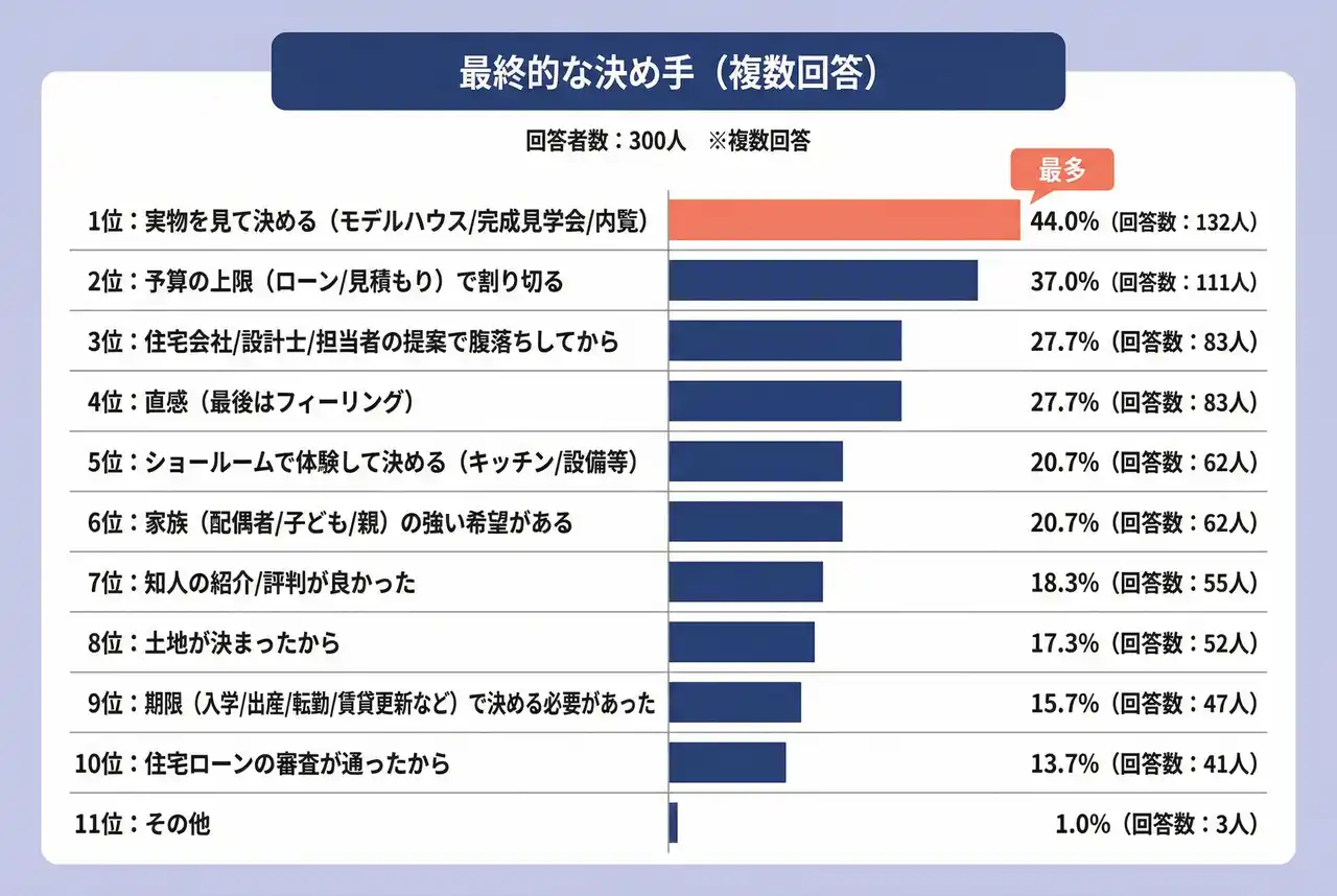 | 最後に、迷いの出口として何が決め手になったか(複数回答)を聞いたところ、実物を見て決めるが最多でした。比較検討が進むほど、ネット情報や図面だけでは判断しきれず、見学・内覧などの体験が意思決定に直結していることが分かります。 | |||