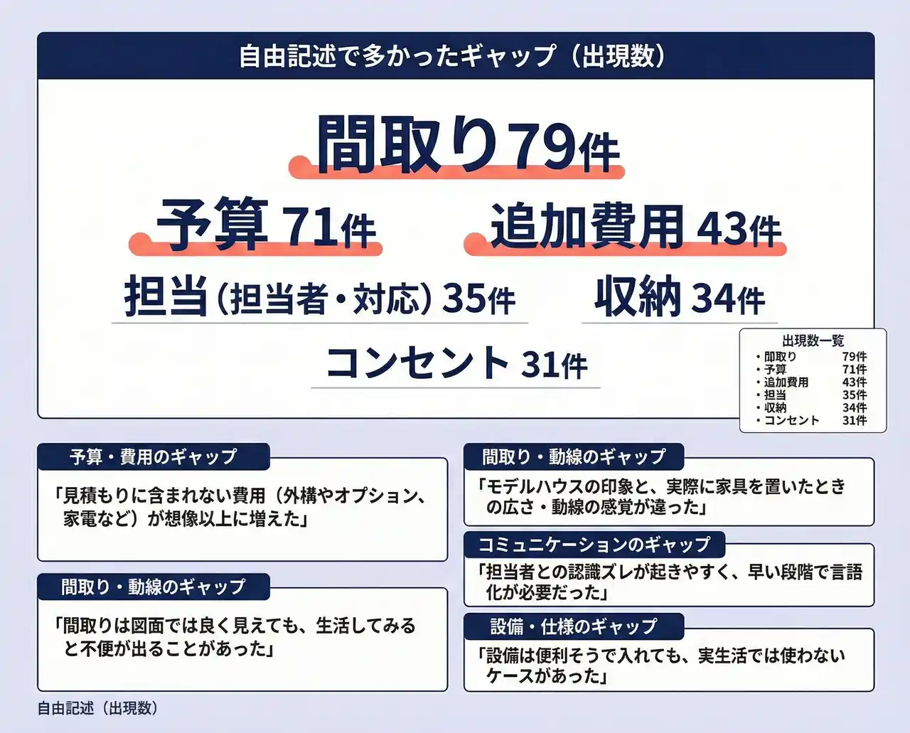 | ・自由記述では間取り79件、予算71件、追加費用43件が多く、想像と現実のズレの中心に | |||