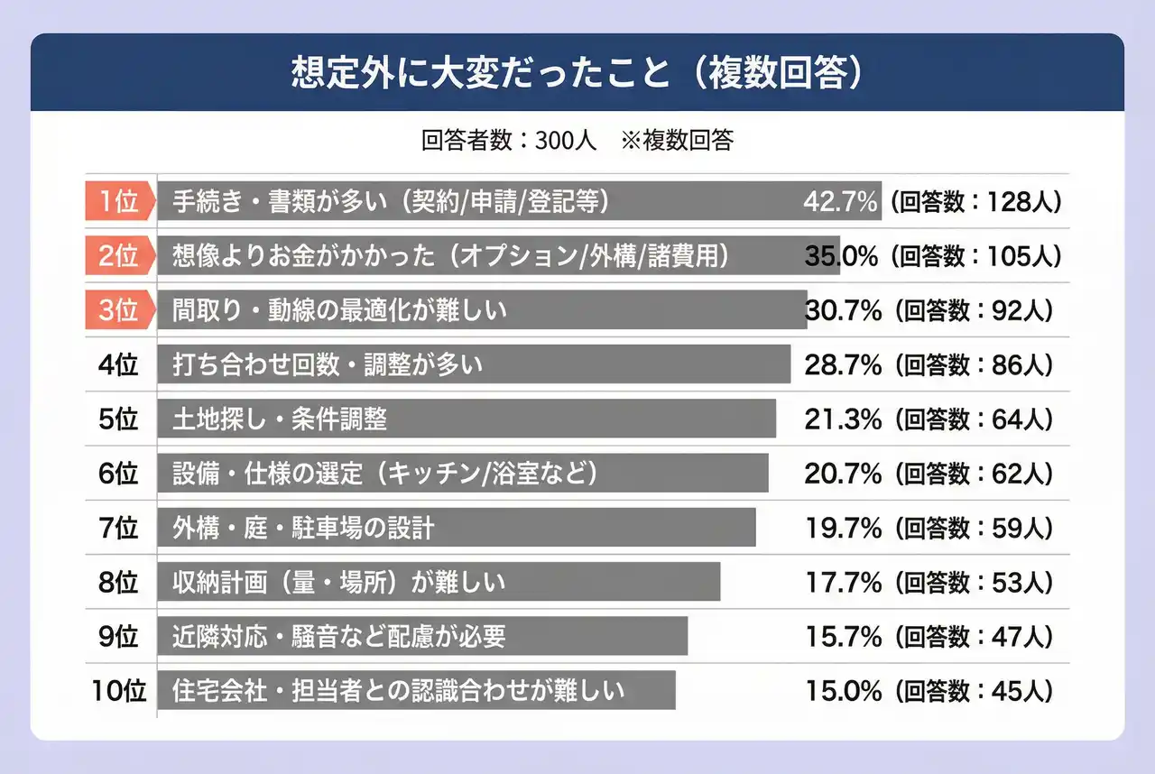 1位:手続き・書類が多い(契約/申請/登記等) 42.7%(128人) 2位:想像よりお金がかかった(オプション/外構/諸費用) 35.0%(105人) 3位:間取り・動線の最適化が難しい 30.7%(92人) 4位:打ち合わせ回数・調整が多い 28.7%(86人) 5位:土地探し・条件調整 21.3%(64人) 6位:設備・仕様の選定(キッチン/浴室など) 20.7%(62人) 7位:外構・庭・駐車場の設計 19.7%(59人) 8位:収納計画(量・場所)が難しい 17.7%(53人) 9位:近隣対応・騒音など配慮が必要 15.7%(47人) 10位:住宅会社・担当者との認識合わせが難しい 15.0%(45人) |