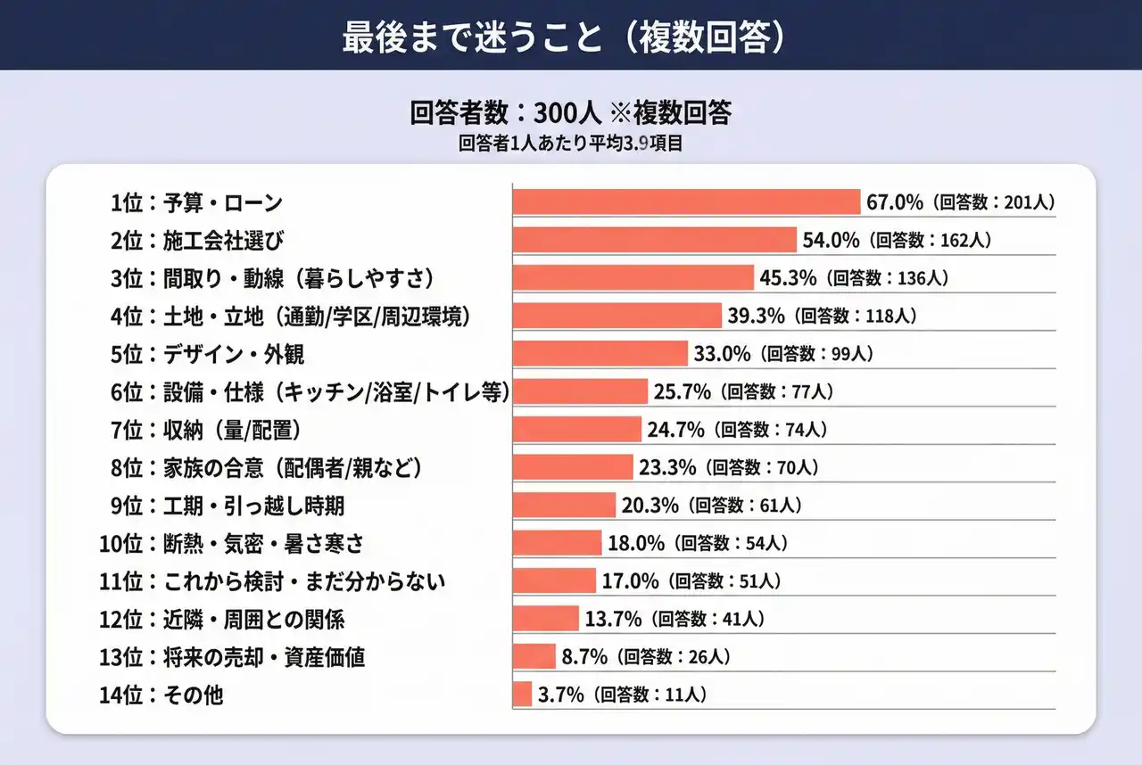 | 家づくりを進める中で最後まで迷うこと(複数回答)を聞いたところ、回答者1人あたりの選択は平均3.9項目でした。上位は予算・ローン、施工会社選び、間取り・動線と、資金と設計、そして依頼先の意思決定が三大論点になっています。 | |||