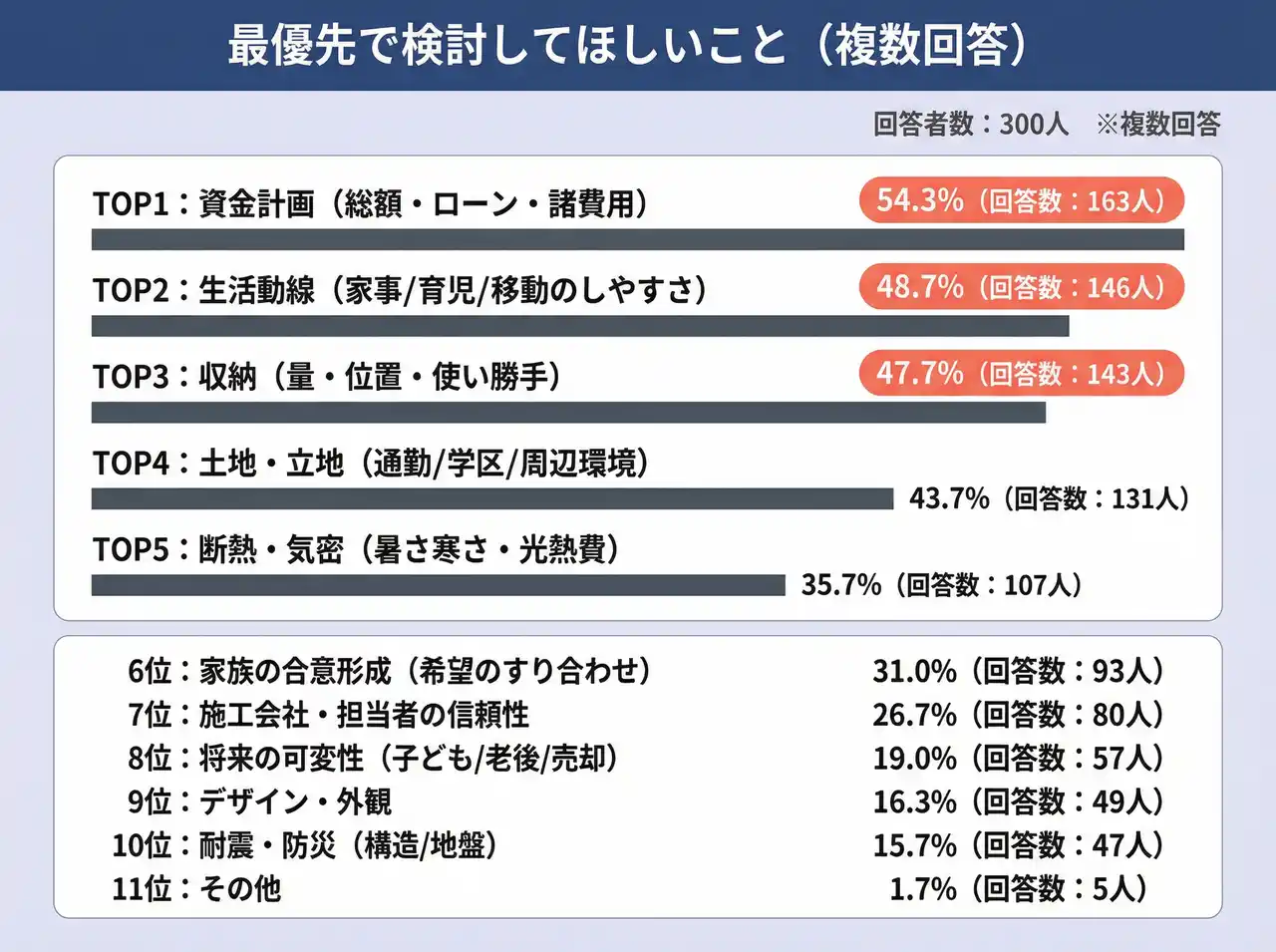 1位:資金計画(総額・ローン・諸費用) 54.3%(163人) 2位:生活動線(家事/育児/移動のしやすさ) 48.7%(146人) 3位:収納(量・位置・使い勝手) 47.7%(143人) 4位:土地・立地(通勤/学区/周辺環境) 43.7%(131人) 5位:断熱・気密(暑さ寒さ・光熱費) 35.7%(107人) 6位:家族の合意形成(希望のすり合わせ) 31.0%(93人) 7位:施工会社・担当者の信頼性 26.7%(80人) 8位:将来の可変性(子ども/老後/売却) 19.0%(57人) 9位:デザイン・外観 16.3%(49人) 10位:耐震・防災(構造/地盤) 15.7%(47人) 11位:その他 1.7%(5人) |