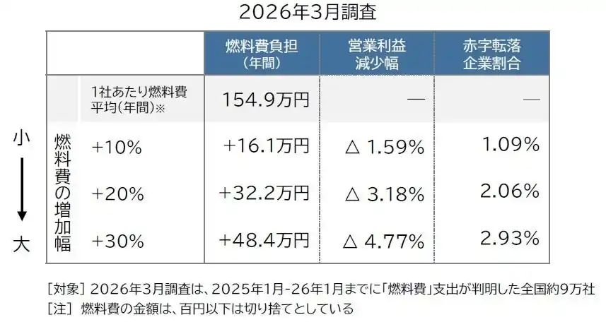 イラン情勢の緊迫化を発端とする燃油価格の急騰が、軽油や重油など石油エネルギーに依存する運輸業や一部製造業を中心に深刻な課題となりつつある。こうした「令和のオイルショック」は、企業の利益をどこまで圧迫する可能性があるのか。帝国データバンクでは、過去1年間に決算を迎えた企業で、ガソリン・軽油代やボイラー向け重油代など「燃料費」を支出する約9万社を対象に、段階的な燃料費の上昇シナリオが利益面に与える影響について調査・検証を行った。 |