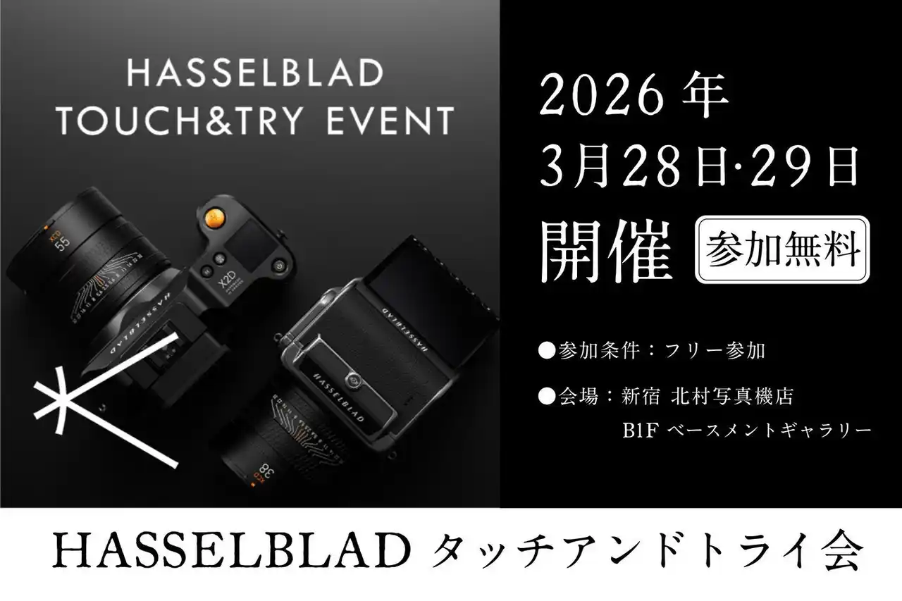 | 株式会社カメラのキタムラ(本社:東京都新宿区、代表取締役社長執行役員:山崎 智彦)が運営する新宿 北村写真機店では、2026年3月28日(土)・3月29日(日)の2日間、新宿 北村写真機店B1F ベースメントギャラリーで、「ハッセルブラッド タッチアンドトライ会」を開催します。 | |||||||