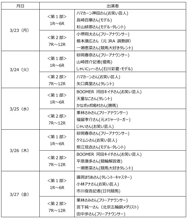 3月23日(月)には、元JRA調教師の根本康広さんが初出演!今月の3日に調教師を引退されたばかりの根本さん。競走馬だけではなく、多くの騎手を指導してこられた名伯楽です。元調教師ならではの深い視点で語られる独自の予想に注目です。3月25日(水)には、元メジャーリーガーの福留孝介さんが登場!現役時代には、現役時代には、中日ドラゴンズやMLBシカゴ・カブスなどで活躍された福留さん。高い出塁率を誇った“選球眼”で勝馬の勝ち筋も見極めることができるのか?注目です。 |