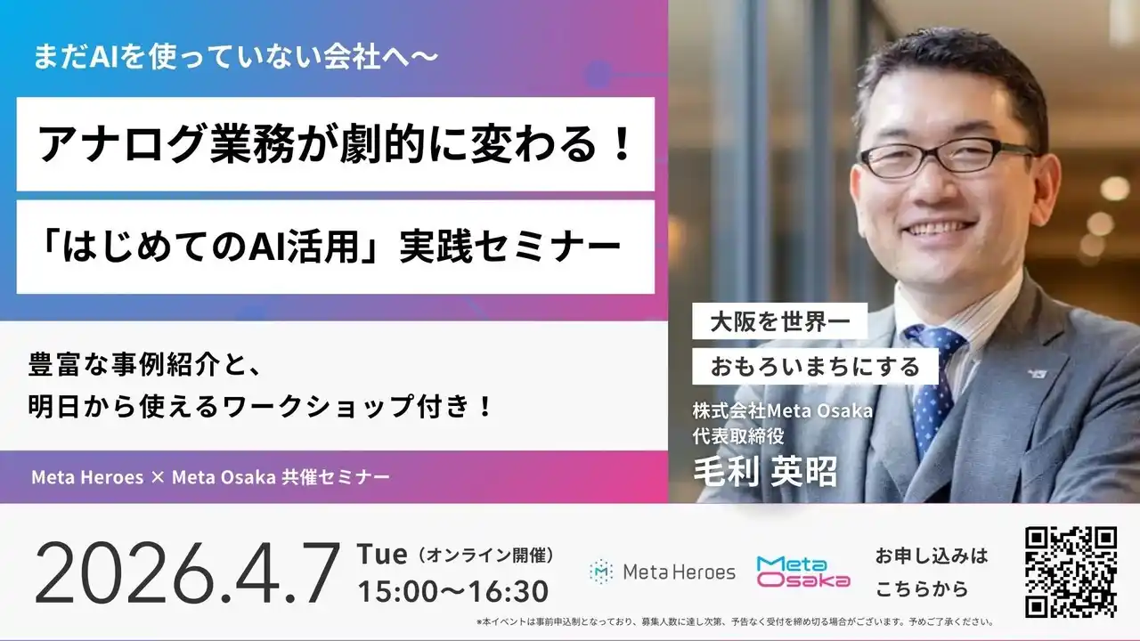 株式会社Meta Heroes(本社所在地:大阪府大阪市、代表取締役:松石和俊、以下「当社」)は、「大阪を世界一おもろいまちにする」を掲げる株式会社Meta Osaka(本社所在地:大阪府大阪市、代表取締役:毛利 英昭、以下「Meta Osaka」)と共同で、2026年4月7日(火)15:00より、経営層・ビジネスリーダーを対象としたオンラインセミナー「アナログ業務が劇的に変わる!『はじめてのAI活用』実践セミナー」を開催いたします。 |