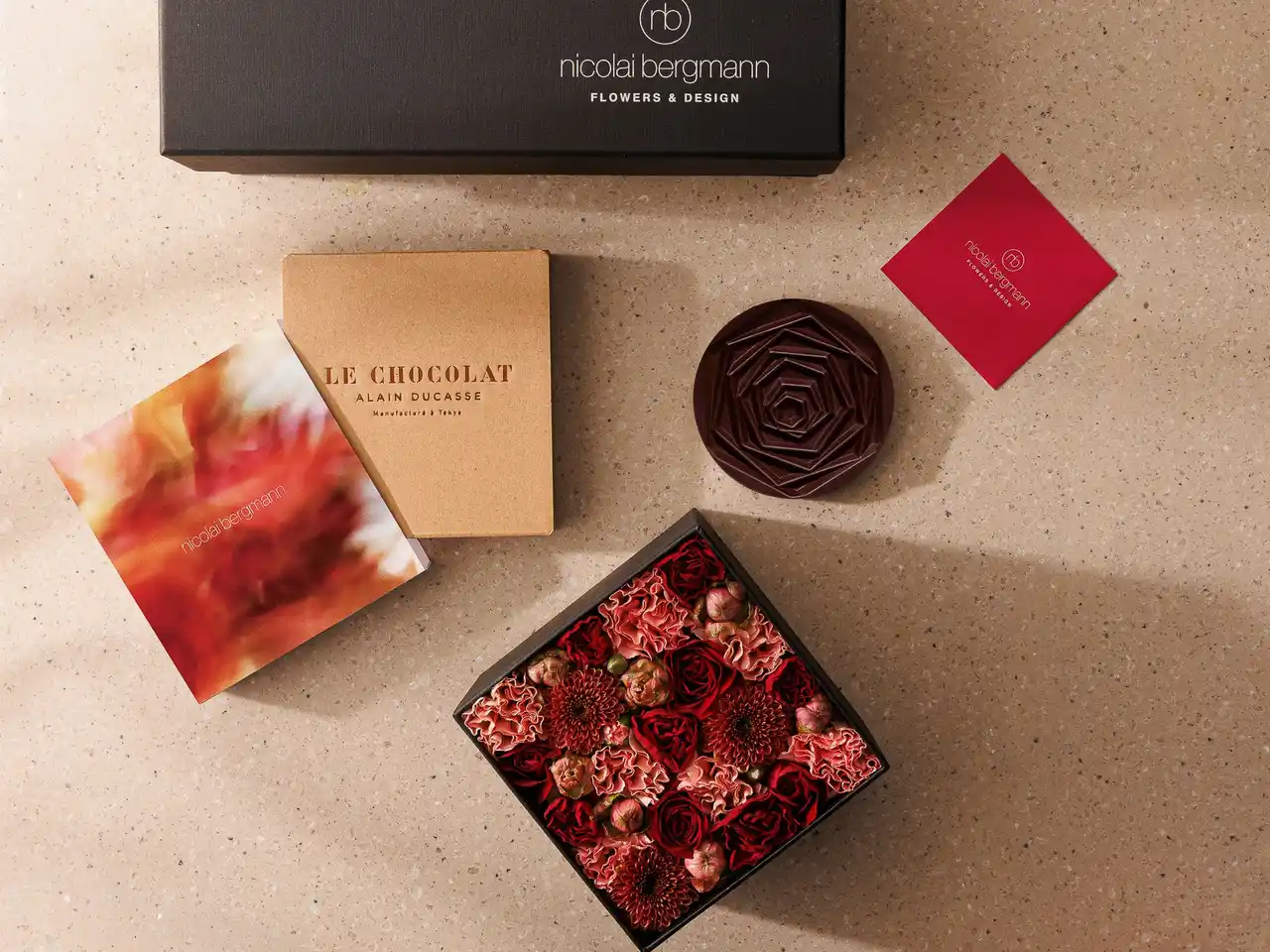 そして、そんなフレッシュフラワーボックスに彩りを添えるかのように、ル・ショコラ・アラン・デュカスのオリジナルショコラ「ローズ・マンディアン ノワール」を組み合わせたフラワーギフトセットをご用意しました。 |