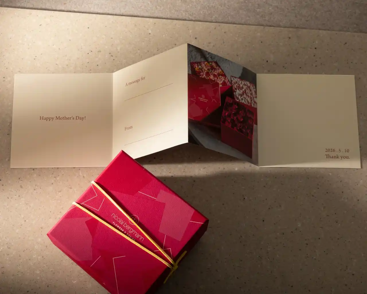 また、各店舗限定の早期購入特典として、4月30日(木)までにご購入いただいた方に、特別なメッセージノートを数量限定でプレゼント。フラワーボックスと同じ素材の紙を使用した蛇腹折りのノートには、ニコライ バーグマンのフラワーアイテムの写真をあしらい、母の日のメッセージを書き添えてお楽しみいただけます。 |