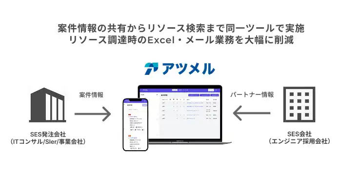 「アツメル」は、SIerとそのパートナー企業(SES会社等)を繋ぐクローズドプラットフォームとして、以下の価値を提供いたします 。 |