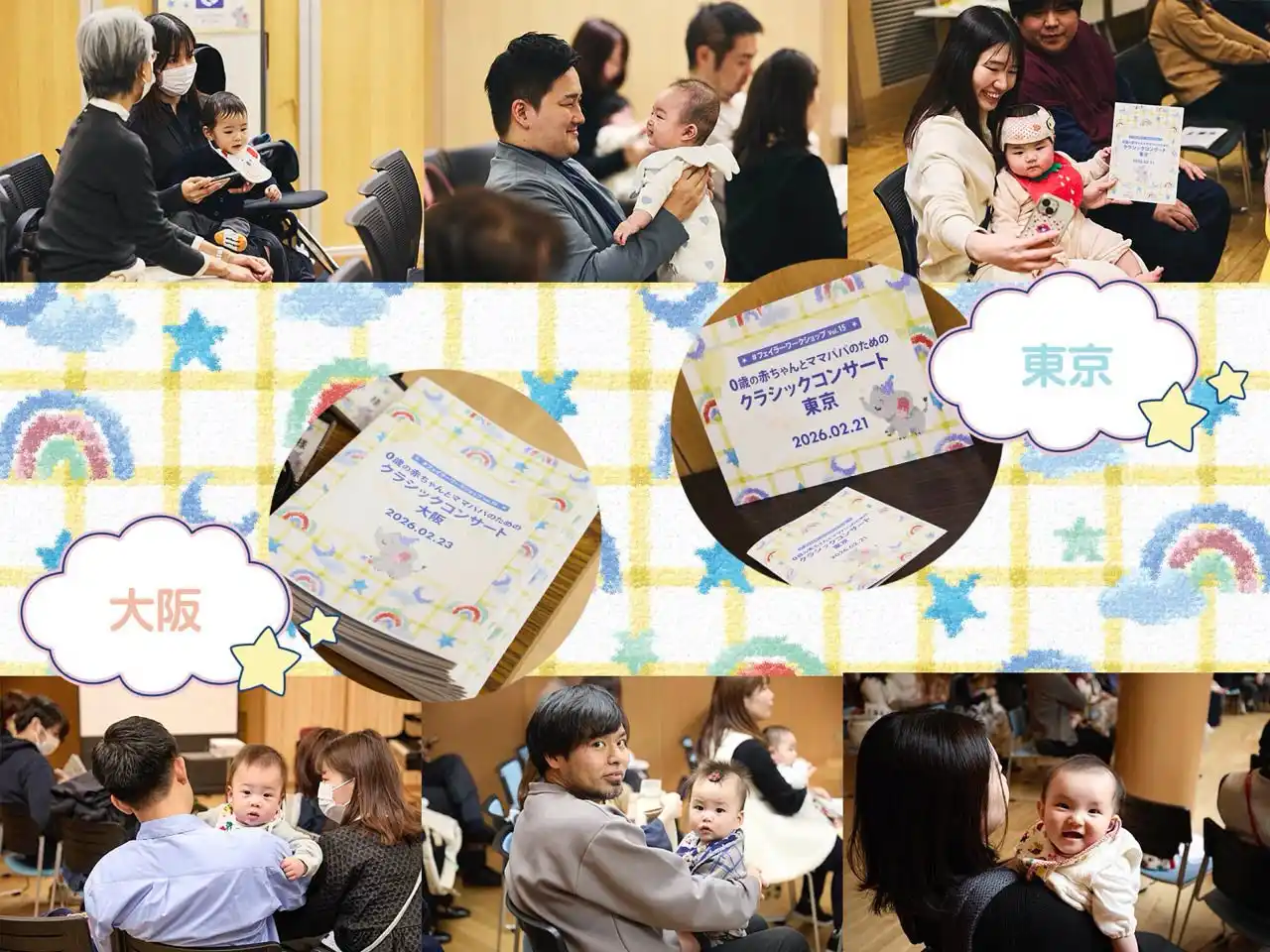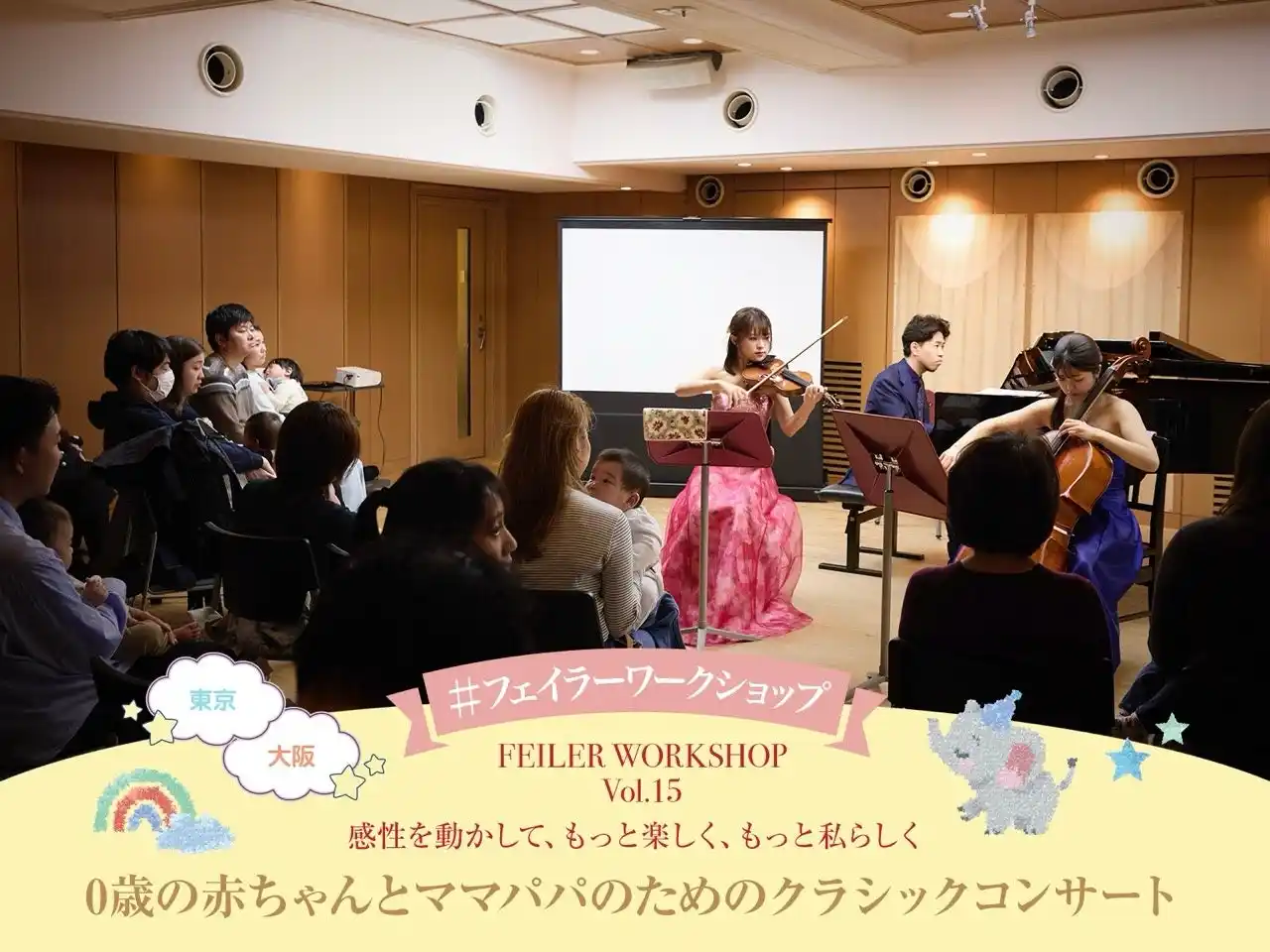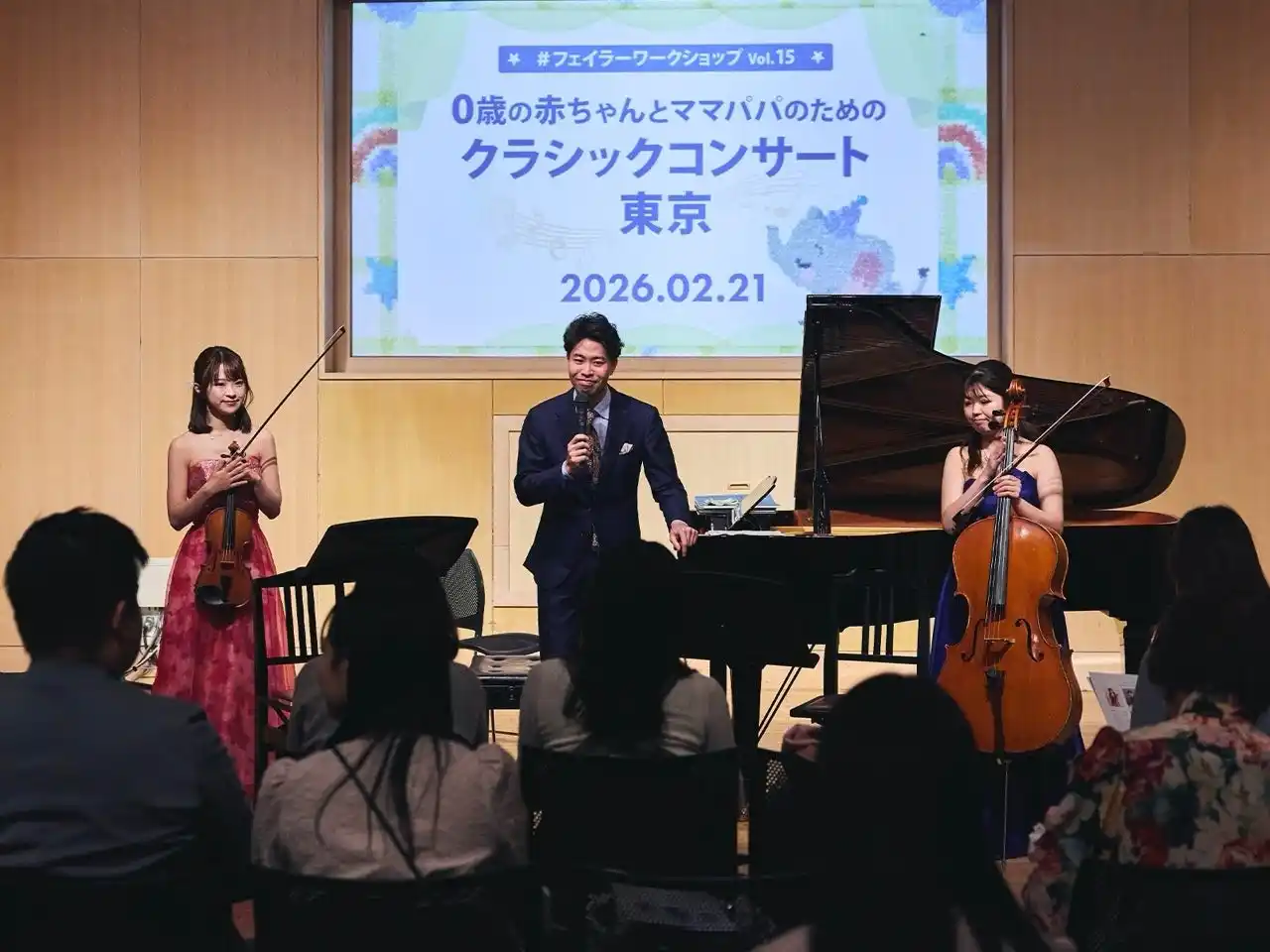 今回で15回目となる第15弾では、2026年3月19日(木)発売予定のベビーの新作『トゥインクルトゥインクル』、『ブルームブルーム』の発売を記念して、0歳の赤ちゃんとママパパのためのクラシックコンサートを東京と大阪で開催。日頃お忙しいママパパに、赤ちゃんと一緒にほんものの音楽を体験できる機会をお届けできればと、世界的に活躍中の若手実力派によるピアノトリオの生演奏をお楽しみいただきました。東京19組、大阪14組のご家族にご参加いただき、本格的なクラシック音楽に間近でふれていただいたコンサートの様子をご紹介します。 |