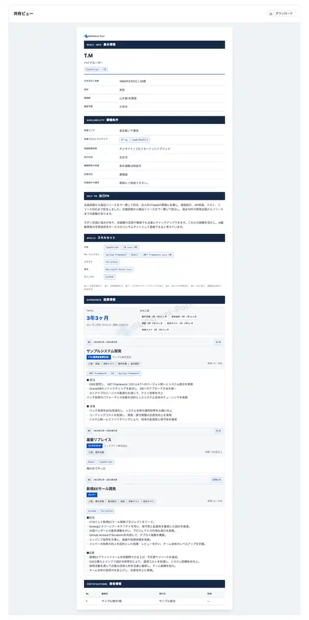 匿名公開モード 氏名・連絡先を伏せた状態でスキルシートを共有可能。エージェント経由の提出など、個人情報を出したくない場面に対応します。 |