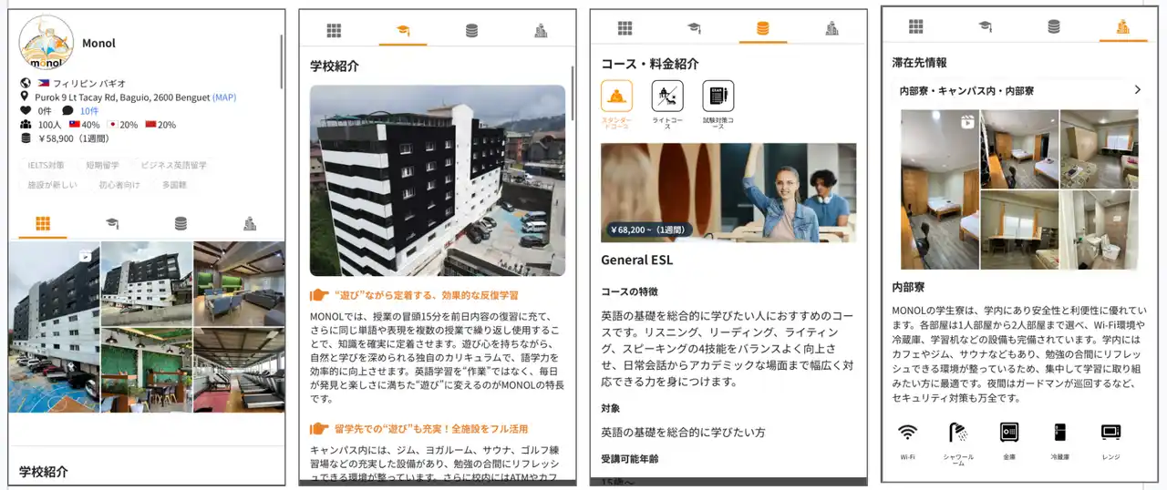 | ネイティブキャンプ留学では、ユーザーが必要な情報を分かりやすく把握できるよう、常に丁寧で明確な情報提供を心がけています。MONOLの詳細情報は、以下の4つのカテゴリーに分けて掲載しており、知りたい情報を的確にお届けします。 | |||