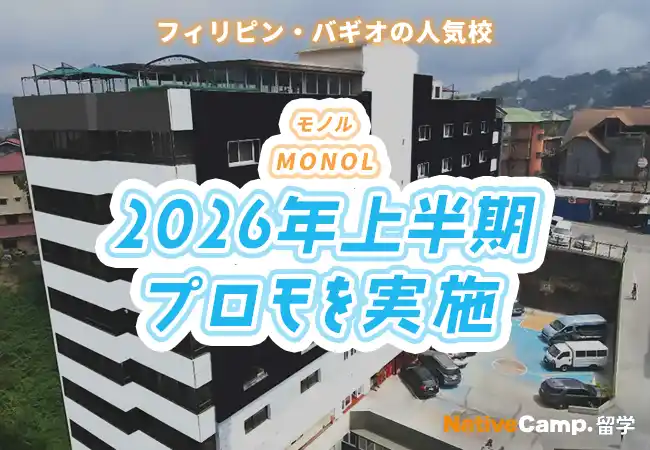 | ネイティブスピーカーと回数無制限のオンライン英会話サービス「ネイティブキャンプ英会話」を展開する株式会社ネイティブキャンプ(東京都渋谷区 代表取締役:谷川国洋)は、海外留学エージェントサービス「ネイティブキャンプ留学」において、フィリピン・バギオの語学学校 MONOL にて、2026年上半期プロモーションを実施いたします。 | |||