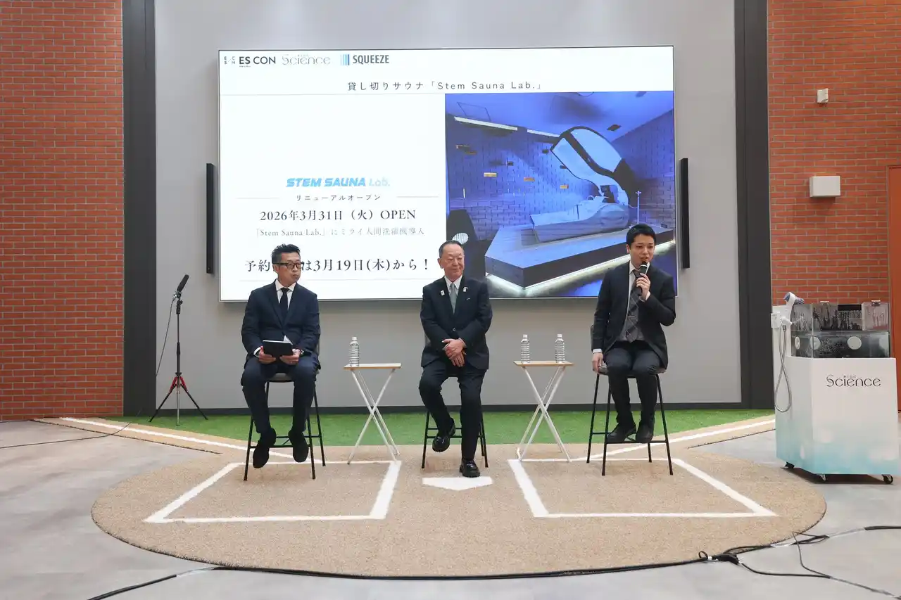 北広島駅前」のサウナ施設に、2025年大阪・関西万博で話題となった次世代入浴装置「ミライ人間洗濯機」を北海道で初めて導入することを決定いたしました。一般利用の開始は2026年3月31日(3月19日より予約受付)を予定しています。本日開催したお披露目会には、ゲストとしてサウナ好きで知られるロッチ コカドさん、ファイターズOBの斎藤 佑樹さん、元ファイターズガールの滝谷 美夢さんをお迎えし、「ミライの入浴」をテーマにトークセッションを行いました。 |