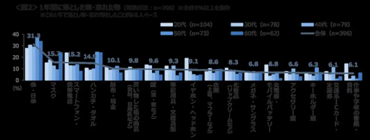 「傘・日傘」が31.3%と落とし物・置き忘れた物として最多。次いで「マスク」「スマートフォン・携帯電話」「ハンカチ・タオル」。 20代は「スマートフォン・携帯電話」「イヤホン・ヘッドホン」「充電器・モバイルバッテリー」が、50~60代は「ハンカチ・タオル」、60代は「マスク」が、他年代に比べ落とした割合が多い。<図2> |